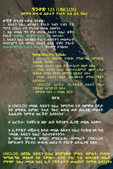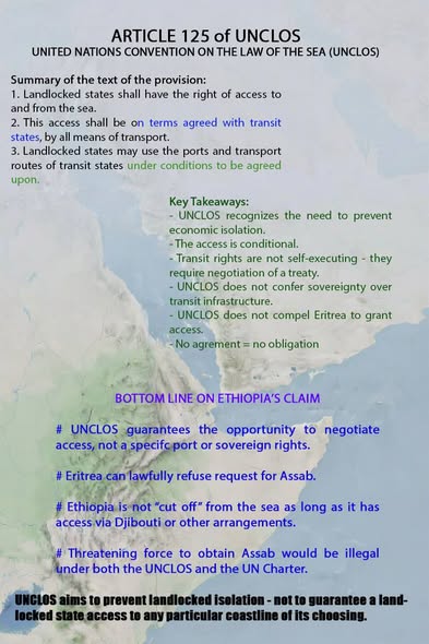International law is clear: UNCLOS guarantees access through agreement, not access by demand. Sovereignty is not negotiable, not transferable under pressure, and not diluted by external expectation. Ethiopia may pursue its interests through diplomacy and commerce, as all states do. Eritrea, in turn, retains the eternal right to control, protect, and negotiate the use of its land and sea in accordance with its national interest.