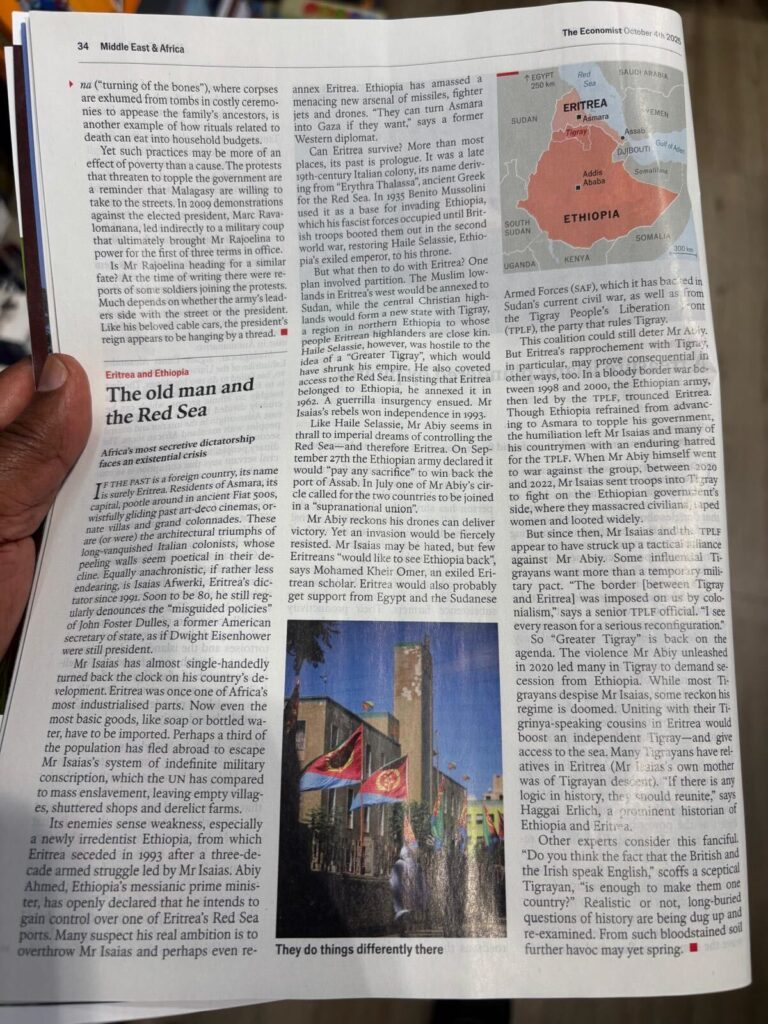 Home 2025 The old man and the Red Sea 2025 The old man and the Red Sea By EritreaFocus - October 6, 2025 40 0 FacebookTwitterPinterestWhatsApp Source: The Economist RELATED ARTICLESMORE FROM AUTHOR 2025 Egypt accuses Ethiopia of ‘reckless’ dam management behind Nile floods, warns of threat to lives 2025 Eritrea courts Trump as opposition gains traction in Washington 2025 Opinion | More than a narcissist’s rant, Trump’s UN address marked a disturbing turn towards a new world order – The Guardian